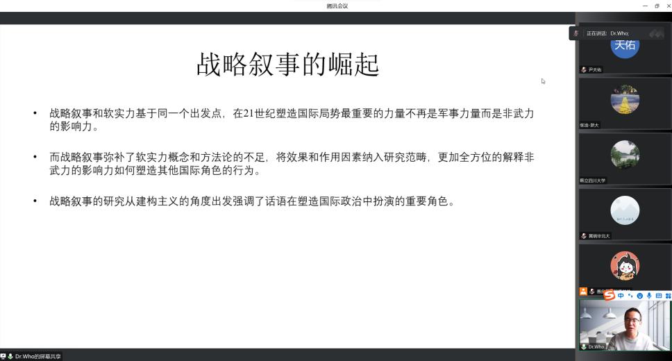 曾敬涵教授从塑造国际局势的手段谈起,让大家对“国际关系”这个复杂的议题产生浓厚的兴趣。随后,曾教授开始了对战略叙事的精彩讲解。首先,曾敬涵教授向我们详细地讲解了战略叙事的概念;紧接着,曾敬涵教授列出了战略叙事的三种类型,分别是Identity narratives、Policy narratives和System narratives。随后,曾教授再次梳理了战略叙事的过程——形成、投射和接收,让我们对战略叙事的内涵和外延有了更加清晰的理解。曾教授列举了数个例子加以说明,让大家对战略叙事的理解更加深刻,同时也对战略叙事的运用有了更加全面的认识。