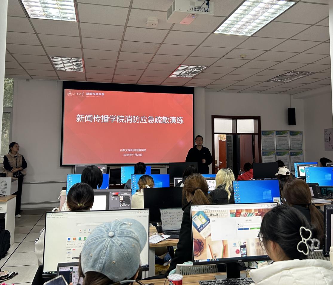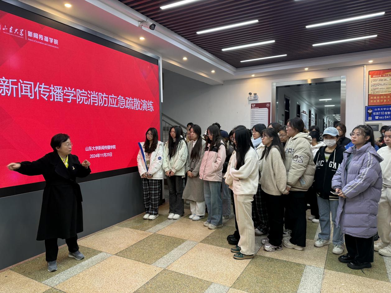 为认真落实学校《关于开展“消防宣传月”活动的通知》,深入贯彻落实习近平总书记关于安全生产和消防安全重要指示批示精神,提高师生应急疏散能力,2024年11月25日山东大学新闻传播学院开展消防应急疏散演练。学院党委书记孙宜山、副书记王丽君、组织员王智洁和院长助理于智源及机关管理人员、各实验室安全负责人和学生等70余人参与活动。