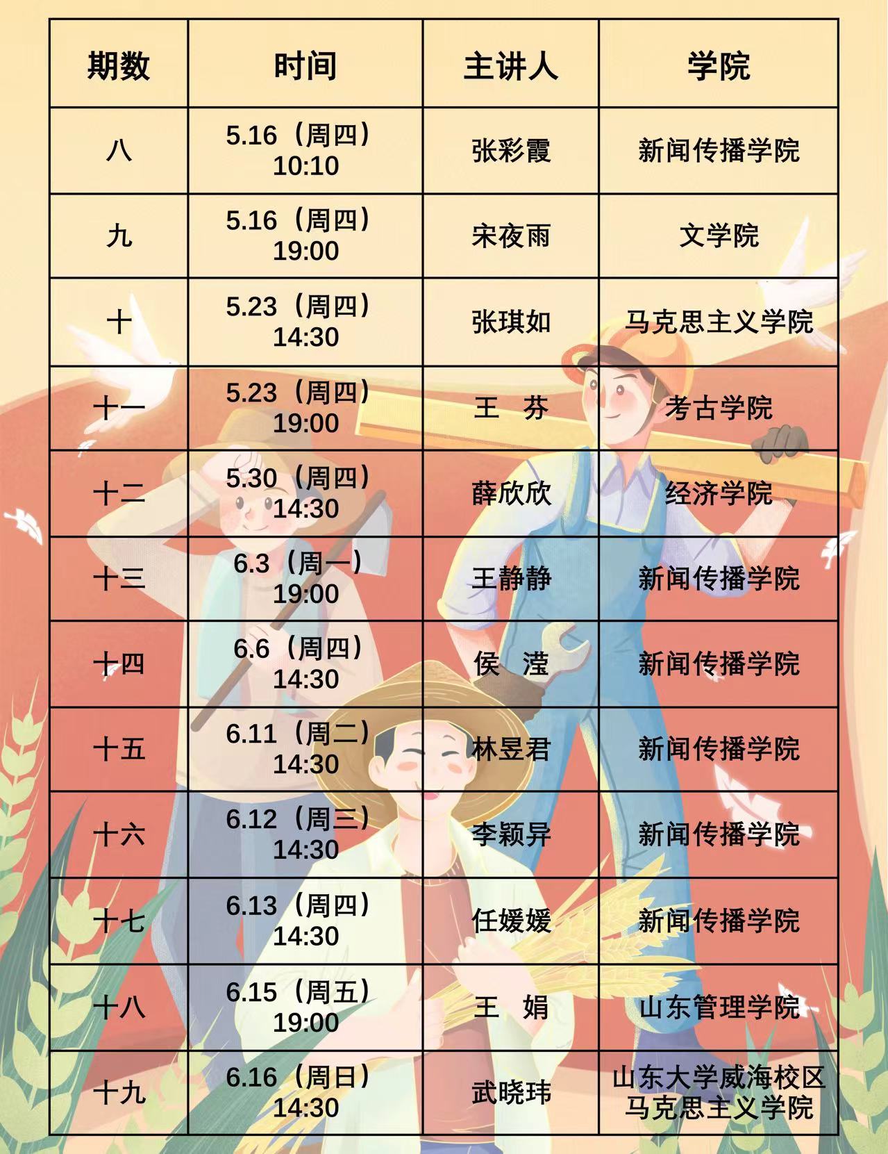 “劳动文化”系列讲座一共十五讲,聚焦马克思主义劳动观、习近平总书记“五育并举”“立德树人”等有关劳动教育重要论述,突出山大“文史见长”特色,挖掘各学科的思政元素,让大学生深入学习“哲学理论指导下的劳动”“历史和文学维度中的劳动美育”“法律和心理方面的劳动实际问题”“传播视角下的劳动精神和劳动观”等模块。