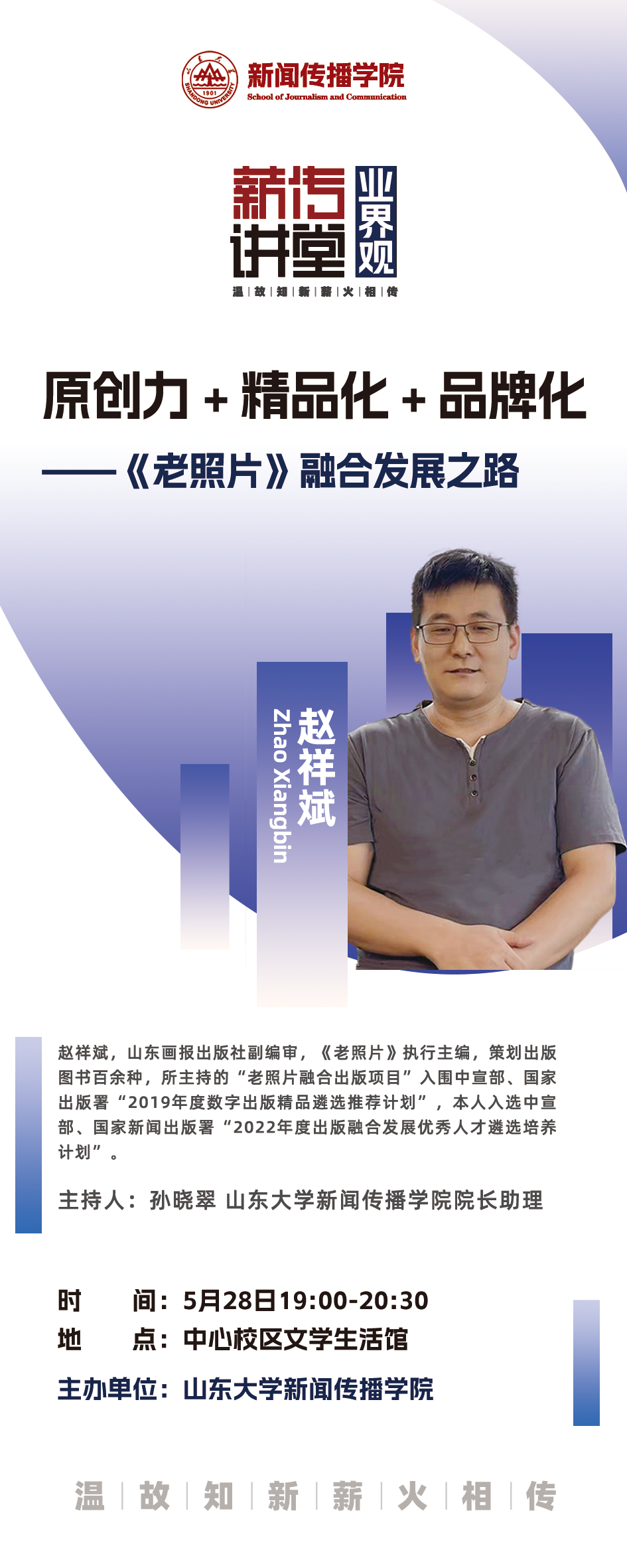 赵祥斌,山东画报出版社副编审,《老照片》执行主编,策划出版图书百余种,所主持的“老照片融合出版项目”入围中宣部、国家出版署“2019年度数字出版精品遴选推荐计划”,本人入选中宣部、国家新闻出版署“2022年度出版融合发展优秀人才遴选培养计划”。