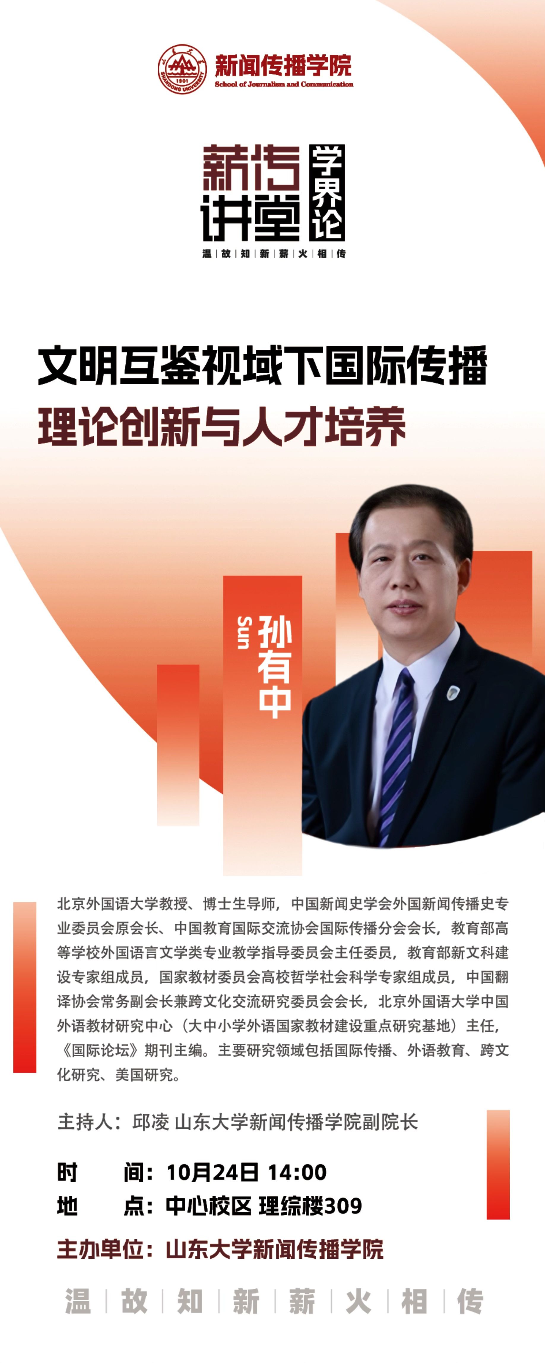 孙有中,北京外国语大学教授、博士生导师,中国新闻史学会外国新闻传播史专业委员会原会长、中国教育国际交流协会国际传播分会会长,教育部高等学校外国语言文学类专业教学指导委员会主任委员,教育部新文科建设专家组成员,国家教材委员会高校哲学社会科学专家组成员,中国翻译协会常务副会长兼跨文化交流研究委员会会长,北京外国语大学中国外语教材研究中心(大中小学外语国家教材建设重点研究基地)主任,《国际论坛》期刊主编。主要研究领域包括国际传播、外语教育、跨文化研究、美国研究。