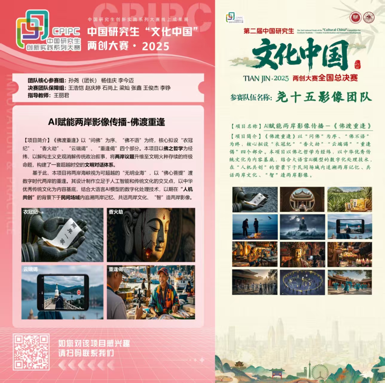 “尧十五影像团队”的《AI赋能两岸影像传播-佛渡重逢》设计制作立足于人工智能和传统文化的交叉点,以中华优秀传统文化为内容基底,结合大语言AI模型的数字化处理技术,在“人机共创”的背景下于民间场域内追溯两岸记忆、共话两岸文化、“智”造两岸影像。在总决赛备赛期间提出的“串珠成线,两岸一家”创意方案成为亮点,为团队在现场路演环节提分增色。