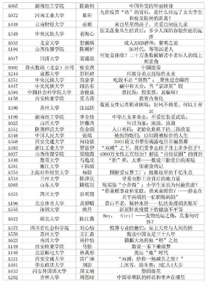 本次大赛由中央民族大学新闻与传播学院、西安交通大学新闻与新媒体学院共同举办,共吸引来自清华大学、北京大学、上海交通大学、复旦大学、南京大学等上百所高校和数十家传媒单位的超过900支队伍,4500余人报名,最终有效作品数量为861份,作品质量再创新高。经过初评、复评与网络投票,来自59所高校和媒体机构的100支队伍入围决赛,角逐等级奖,决赛评出10名一等奖、20名二等奖、30名三等奖和40名优秀奖。