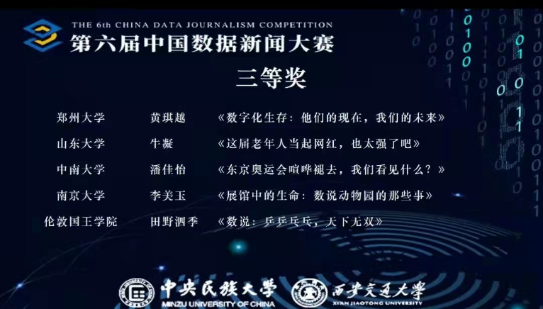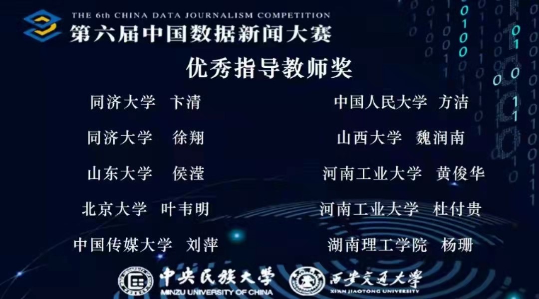11月6日第六届中国数据新闻大赛决赛落下帷幕,我院2018级本科生牛凝、杨婷丹、汪龙佳团队参赛作品《这届老年人当起网红,也太强了吧!》获得三等奖、研究生陆炫羽团队作品《现实版“小舍得”:小学生家长为何最焦虑?》获得优秀奖、新媒体系教师侯滢和实验室助教郭嘉良分别获得优秀指导教师奖。