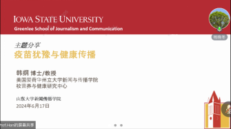 6月17日,美国爱荷华州立大学新闻与传播学院教授韩纲应邀为山东大学新闻传播学院师生做题为“疫苗犹豫与健康传播”的专题讲座,新闻传播学院教授杨晓冬主持讲座。