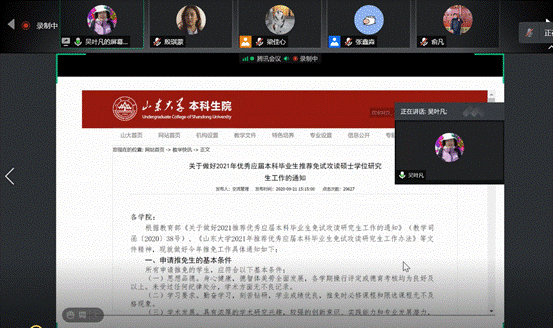 12月12日晚,“新问心答”第一期之保研分享会在线上顺利开展。“新问心答”是由山东大学新闻传播学院本科生党支部主办的系列交流活动,旨在促进学子交流,增强本科党支部影响力和引导力。第一期保研分享活动邀请了俞凡教授和李亭竹、吴叶凡、窦培育三名2017级本科优秀学子进行分享,本科生党支部书记许玉莲参会,会议由2018级入党积极分子梁佳心主持。
