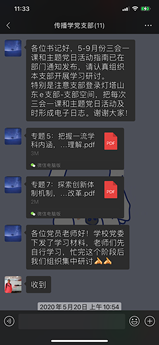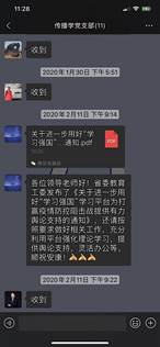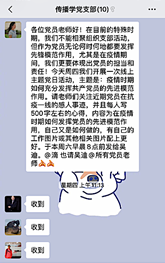 由于无法线下沟通,传播学党支部在微信群内及时传达学习领会上级重要指示精神和党中央关于疫情防控工作的决策部署,并落实到每一位老师,确保上请下达。学院在疫情期间关于疫情防控的各项信息统计、筛查、汇总等工作,