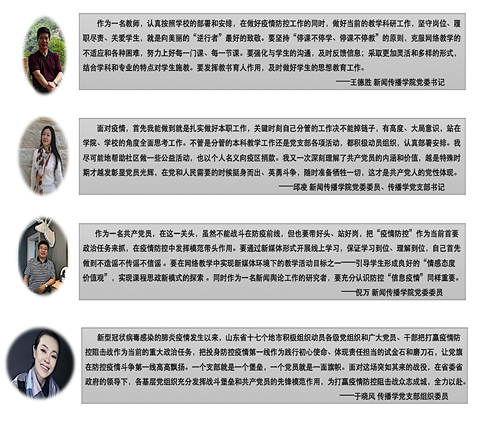 都由党员老师快速响应、主动承担,认真负责完成任务。传播学党支部还利用专业优势,及时解疑释惑,不信谣不传谣,加强思想政治工作,狠抓意识形态工作。