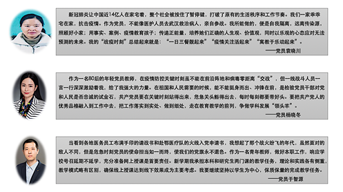 2月20日传播学党支部开展了主题为“疫情时期如何充分发挥党员先进模范作用”的线上主题党日活动,组织老师们学习疫情期间党员先进事迹,结合本职工作谈谈心得体会。老师们积极回应,纷纷分享近期所思所感,现节选部分老师的心得内容供交流。