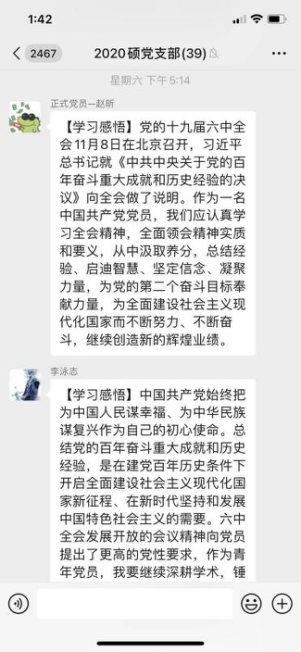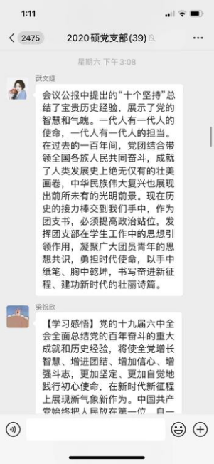 11月19日,新闻传播学院2020级硕士生党支部组织开展专题学习活动,共同深入学习贯彻党的十九届六中全会精神,并研讨了习近平总书记关于党的建设、科技创新的重要论述。活动以线上学习分享感悟的方式进行,由党支部书记戴永洁主持,支部全体党员、积极分子参加。