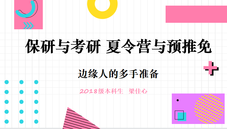 梁佳心讲述了自己作为保研边缘人的多手准备。以“保研与考研 夏令营与预推免”作为主题,她从自己的个人情况、保研途径、什么是保研边缘人、保研边缘人如何准备这四个层面来介绍了自己的经验,分享了她保研与考研、夏令营与预推免的双重准备和面试、笔试的注意事项。最后,她告诉大家,在任何时候都要给自己留一条后路,永远保持对知识的渴求和不满足,以平常心对待保研。