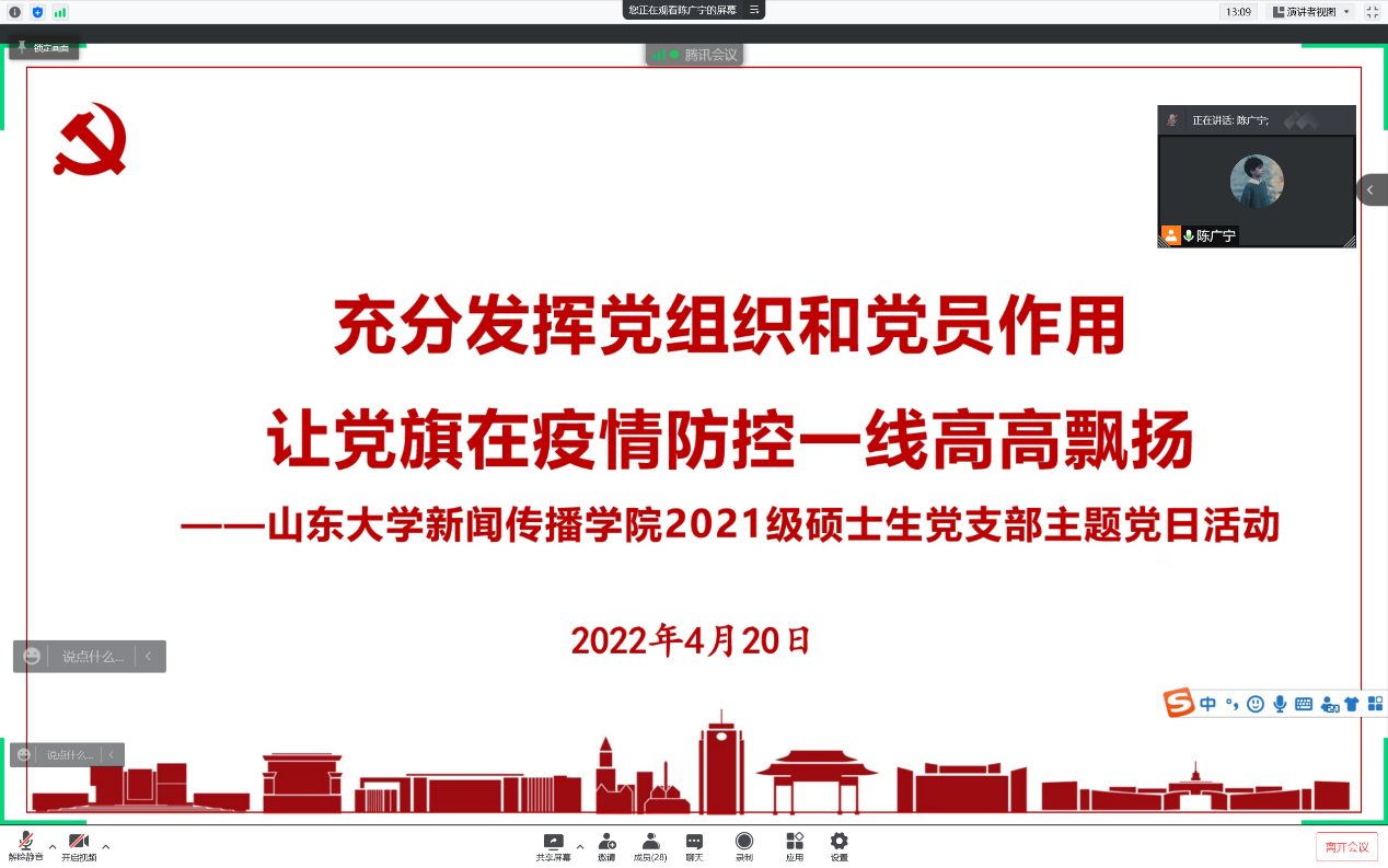 4月20日晚,新闻传播学院2021级硕士生党支部围绕“建强‘疫’线战斗堡垒、攻坚克难干事创业”主题开展线上主题党日活动。此次会议应到党员28人,实到党员28人,符合规定人数召开会议。会议由青年委员陈广宁同志主持。