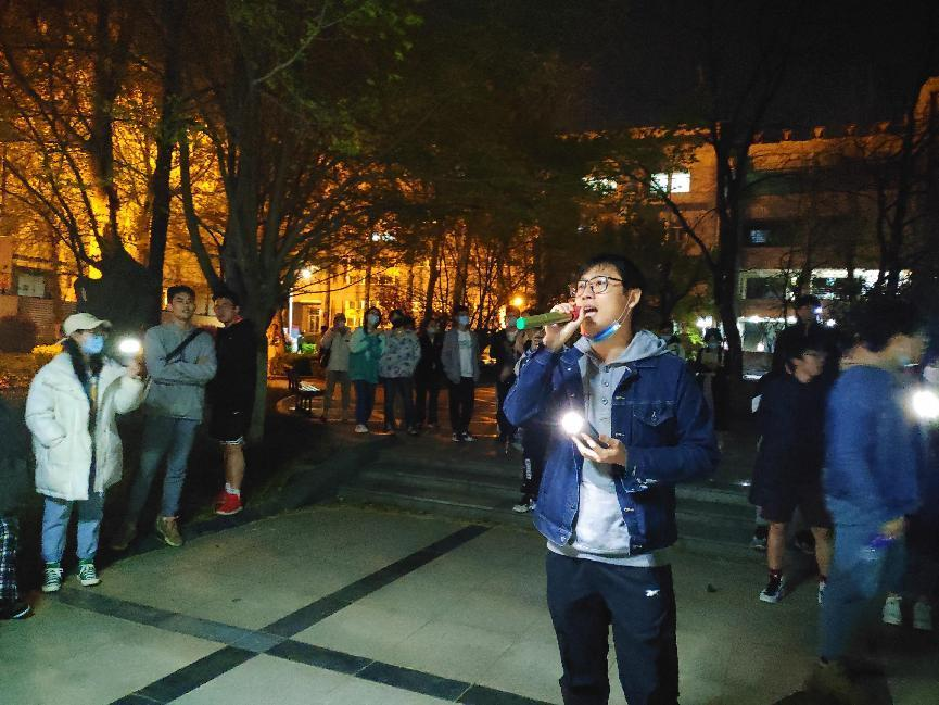 广场K歌心飞扬。为缓解封校期间师生的学习、工作和生活压力,丰富课余生活,入党积极分子周胜龙已经组织开展了5天的“新传小夜场——校园K歌”活动。“起初,我们只是出于自娱自乐的目的,拉着音响去广场唱唱歌。在我们玩的过程中,同学们开始围观,人也越聚越多,大家一边听歌一边开始鼓掌互动,也有越来越多的人鼓起勇气主动参与进来,大家相互交流,彼此欣赏,现场氛围也越发热烈。”他提到,该活动最初由学院爱好唱歌的同学自发组织,后来得到了学院大力支持,拥有了全新的音响设备等。现在经过学校审批后,服务范围已经面向中心校区全体师生员工。周胜龙认为:“歌声能够抚慰人心,积极的交流能缓解消极情绪,K歌会给大家提供了一个释放压力的平台,这点正是它的意义所在。”