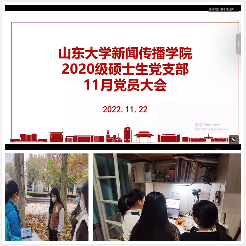11月22日上午,新闻传播学院2020级硕士生党支部接收中共预备党员会议在中心校区稷下广场举行。本次会议的主题是讨论吸收梁梦秋、李雅琳两位同志为中共预备党员的事宜。大会由党支部书记戴永洁主持,学院组织员王智洁列席本次会议,2020级硕士生党支部全体党员通过线上线下相结合的方式参加。