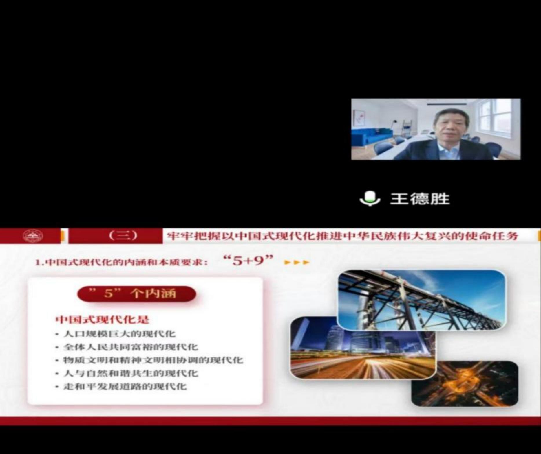 王德胜指出,学习宣传贯彻党的二十大精神是当前和今后一个时期的首要政治任务。习近平总书记提出的“五个牢牢把握”,是学习贯彻党的二十大精神的“金钥匙”,具有方法论的重要指导意义。同时,要全面准确,深入理解内涵,精准把握外延,还必须坚持“九个深刻领会”。学习贯彻党的二十大精神,要牢牢把握过去5年工作和新时代10年伟大变革的重大意义,牢牢把握新时代中国特色社会主义思想的世界观和方法论,牢牢把握以中国式现代化推进中华民族伟大复兴的使命任务,牢牢把握以伟大自我革命引领伟大社会革命的重要要求,牢牢把握团结奋斗的时代要求。其中,王德胜结合实际列举并阐述了“三件大事”“四个里程碑意义”“六个坚持”“中国现代化五个内涵和九个本质要求”“斗争精神”“团结奋斗”等党的二十大报告中的一系列新思想、新论断、新提法。此外,王德胜强调,学习贯彻党的二十大精神,要在全面学习、全面把握、全面落实上下功夫,并按照学校党委提出的“七大战略”的提档升级,结合学院实际、结合学科实际、结合教学科研实际、结合个人思想实际,系统把握、全面思考、重点领悟、落到实处。