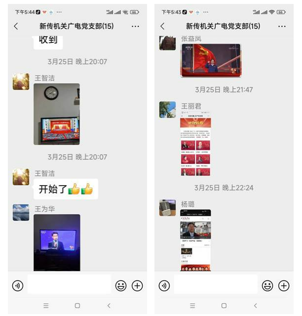 根据新闻传播学院机关广电党支部实际情况,党支部通过线上微信平台---党员学习交流群,组织大家边观看边交流。