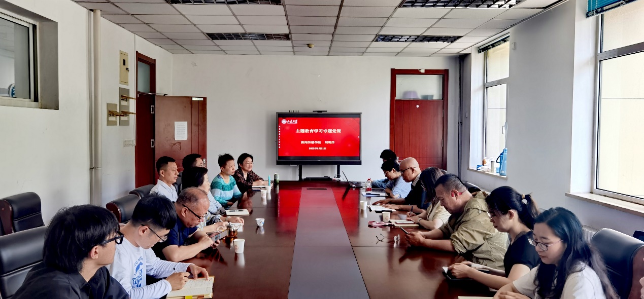 为推动学习贯彻习近平新时代中国特色社会主义思想主题教育走深走实,聚焦教育强国建设和学院高质量发展规划,6月21日上午,新闻传播学院在中心校区生命南楼209会议室开展主题教育学习专题党课,党课由院长、党委副书记刘明洋主讲,党委副书记王丽君、组织员王智洁以及各党支部党员参加学习。