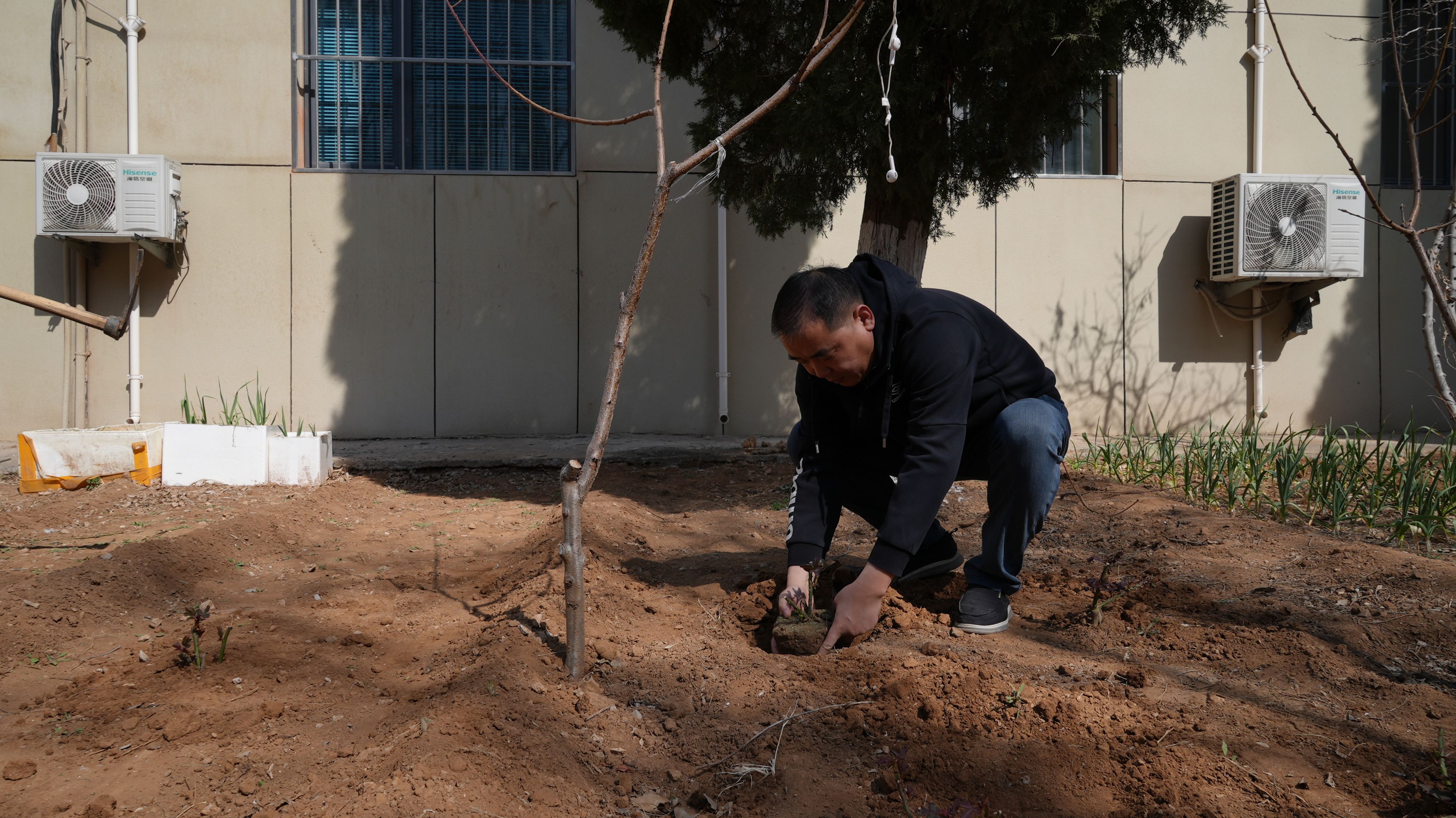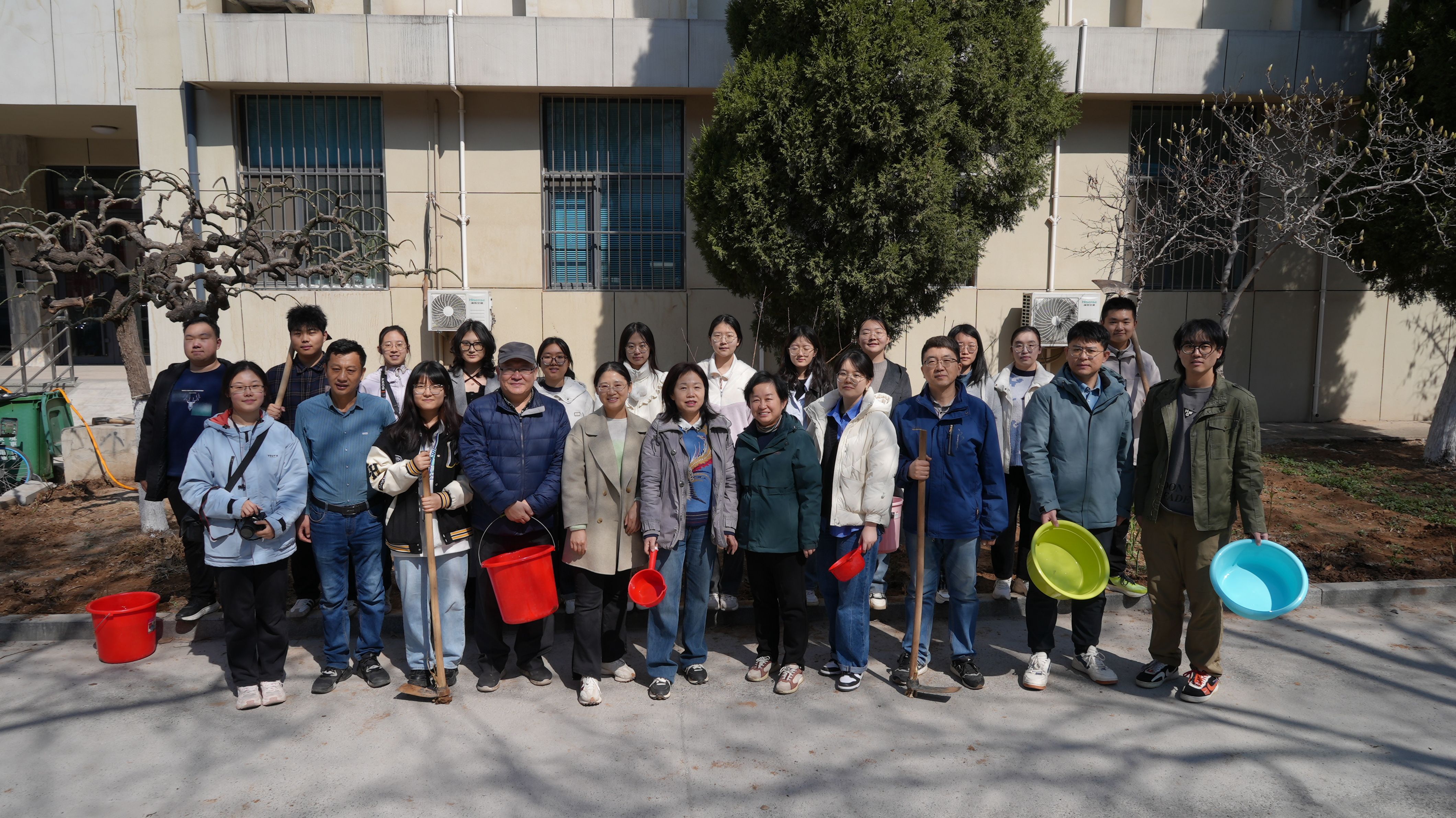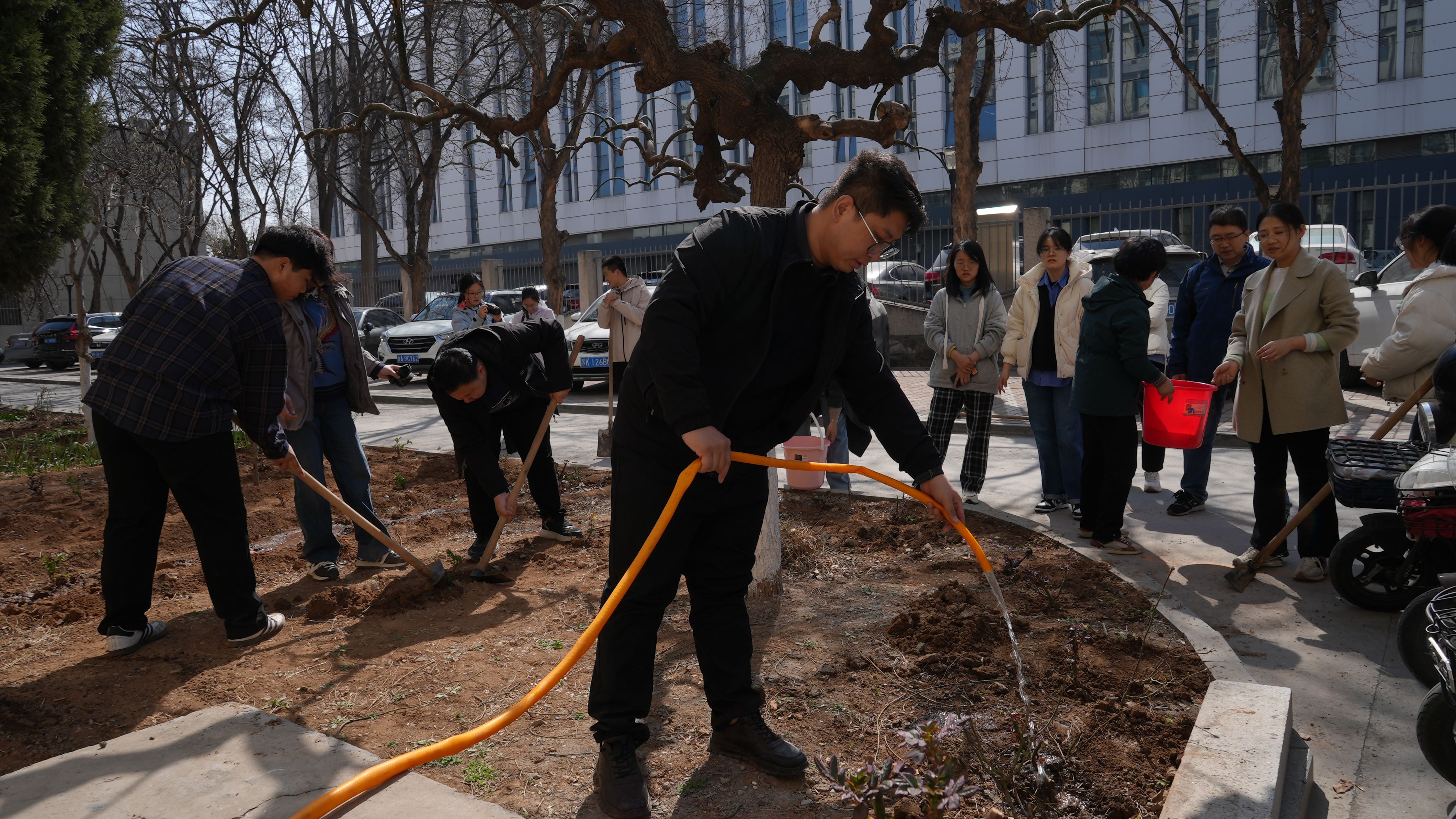 机关广电党支部与本科生党支部一起,在生物楼前,共计栽植月季30余株。植树现场,大家用锄头挖出一个个土坑,栽上月季花的嫩苗,弯下身子轻轻地培土、浇水,认真护理着绿色希望。看似简单的工作,真正拿起锄头还是有些吃力;看似不大的水桶,真提起来还是沉甸甸的。经过大家齐心协力,默契配合,每个人都干劲十足,现场一片繁忙景象,一株株月季被整齐地种在了教学楼前。