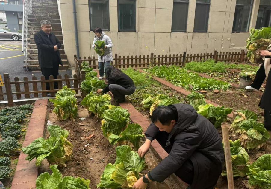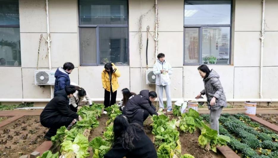 2024年,新闻传播学院小菜园的种植工作一直未间断过,从春天的翻土、种苗到浇水、除草,大家付出了许多辛勤劳动,终于迎来了丰收的喜悦。恰逢秋冬交替,冒着寒冷的小雨,学院师生们热火朝天地在农场里对大白菜、胡萝卜、小白菜等不耐冻蔬菜进行采摘。饱满结实的白菜头,郁郁葱葱的小白菜展示着劳动教育的成果。大家交流采摘经验,相互协作,探讨种植的乐趣,很快便收获满满,现场一片喜气扬扬。