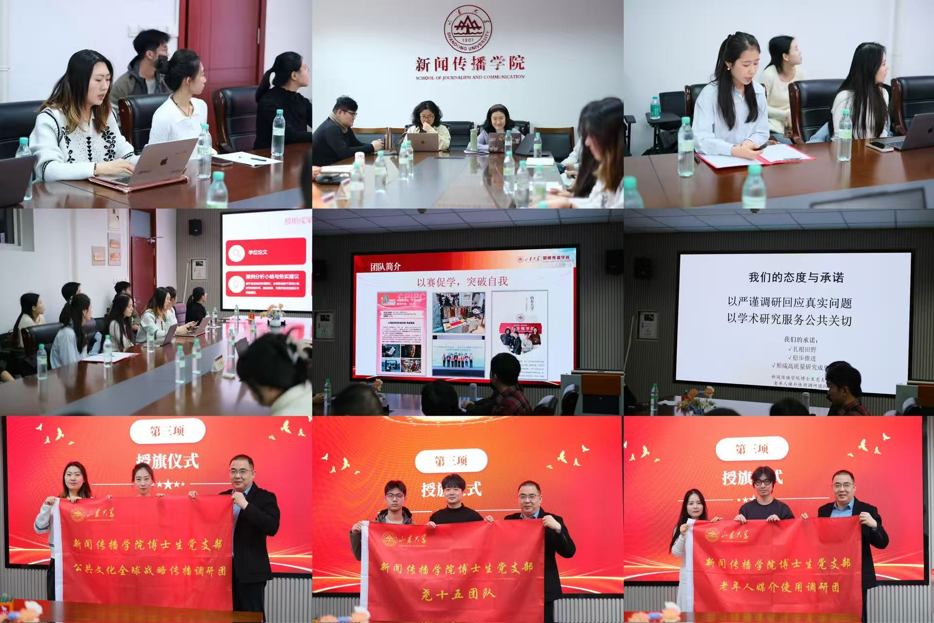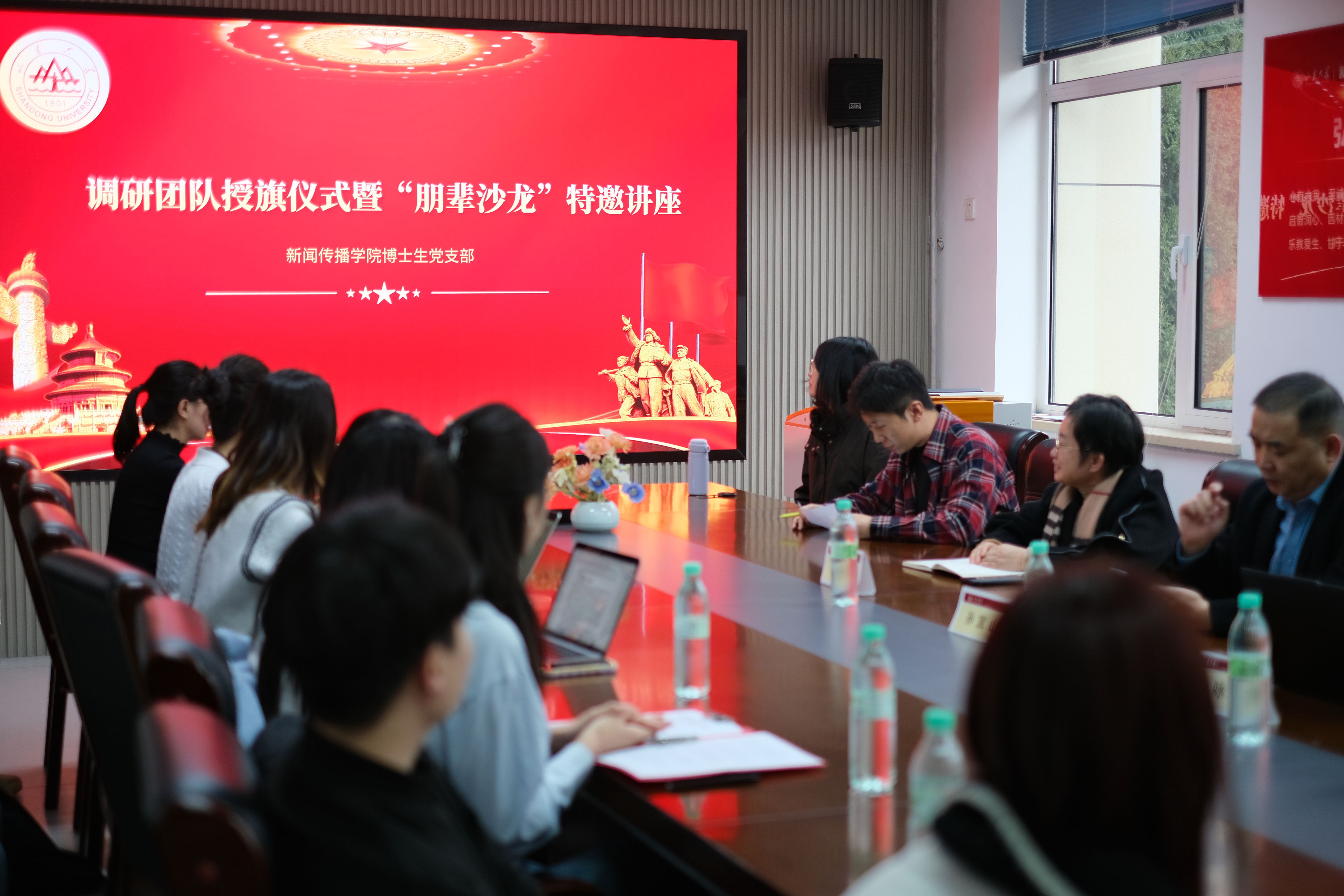 为深入推动党建与科研实践深度融合,将组织优势转化为发展动能,2026年1月14日,新闻传播学院博士生党支部于生命南楼209会议室成功举办调研团队授旗仪式暨朋辈沙龙特邀讲座。学院党委书记孙宜山、党委副书记王丽君,新闻所王咏梅教授参加会议,博士生党支部党员、博士生团支部团员及硕士生党员代表共同参与。