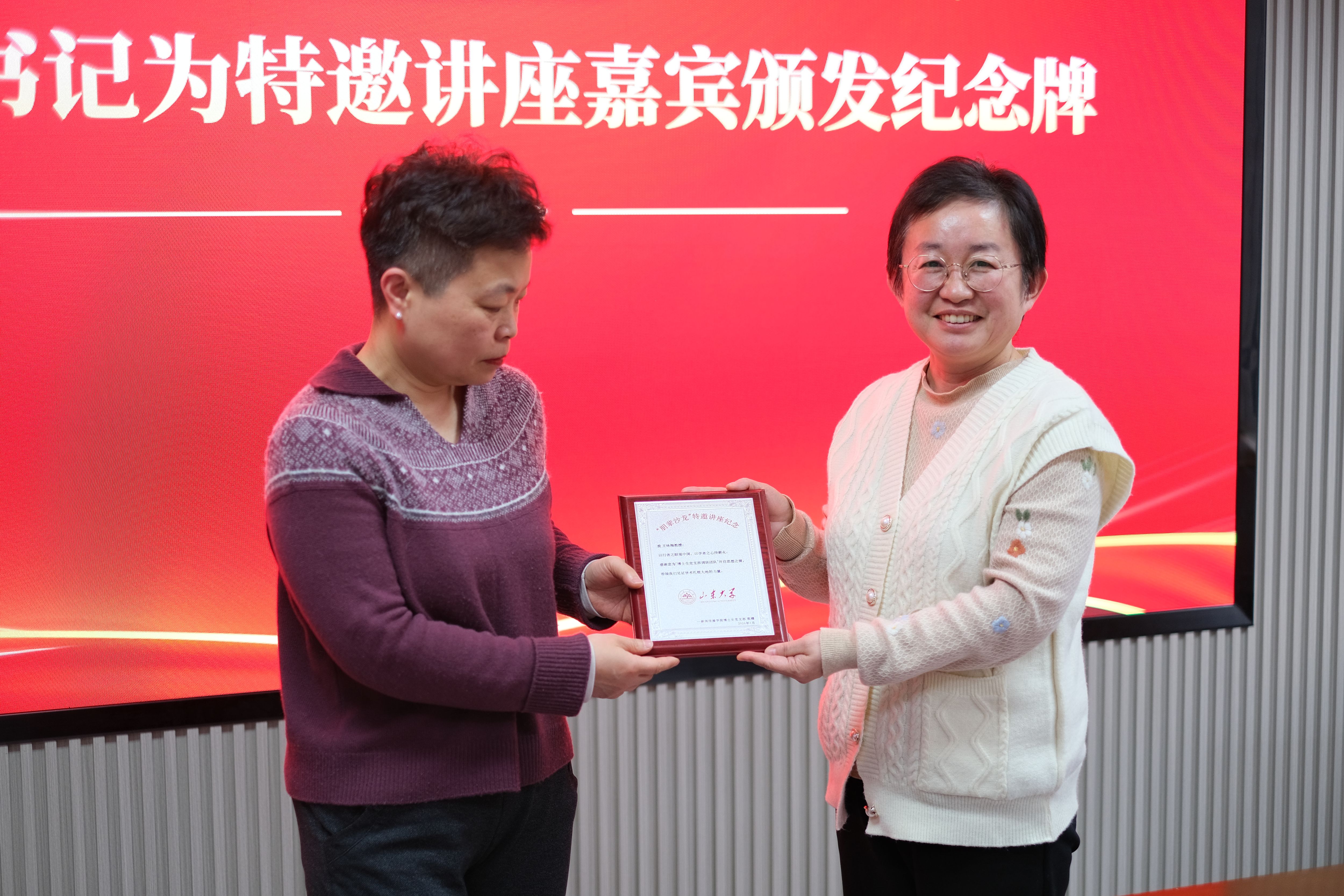 讲座结束后,王丽君代表博士生党支部向王咏梅教授颁发朋辈沙龙特邀讲座纪念牌,感谢其无私的分享。王丽君高度评价了王咏梅团队取得的丰硕成果及其教学示范价值,并鼓励博士生党员在调研中学习这种深耕细作、将历史研究与现实关怀相结合的精神。