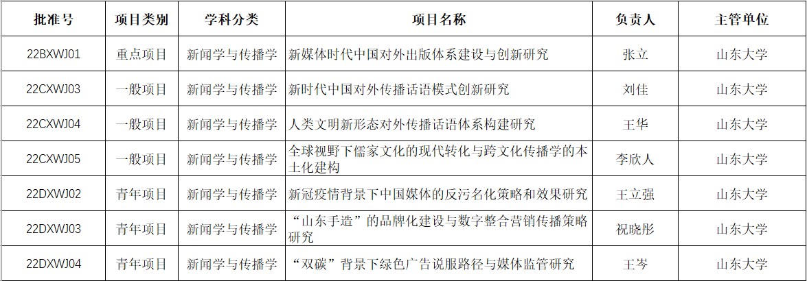 据悉,山东省哲学社会科学工作办公室经过通讯初评、会议评审,共评选出拟立项项目590项,包含年度项目558项、研究专项32项,其中新闻学与传播学科15项。我院在项目前期申报过程中,积极组织教师申报,对申报组织工作实施精细化管理服务,通过校内外专家审核、评议修改等举措进行推荐上报,力争高立项率,立项数量在同类兄弟高校中名列前茅,实现了项目申报数量、质量的双提升。