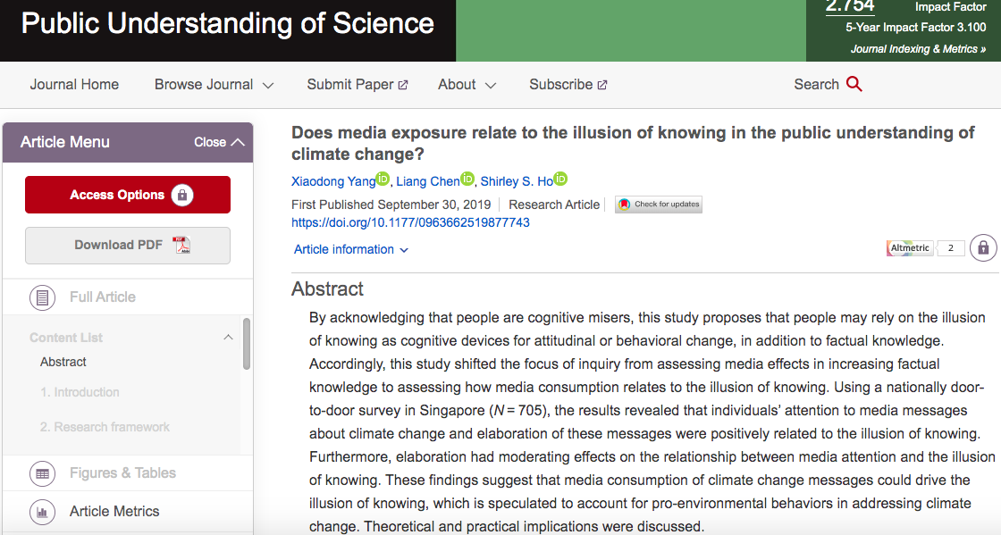 近日,我院副研究员杨晓冬老师以第一作者身份在SSCI一区顶级期刊Public Understanding of Science发表了题为“Does Media Exposure Relate to the Illusion of Knowing in the Public Understanding of Climate Change?”的学术研究论文。Public Understanding of Science为新闻传播学专业期刊,致力于发表关于科学与公众的国际前沿研究成果,具有较大的学术影响力。这是山东大学新闻传播学院教师首次在该期刊发表文章。