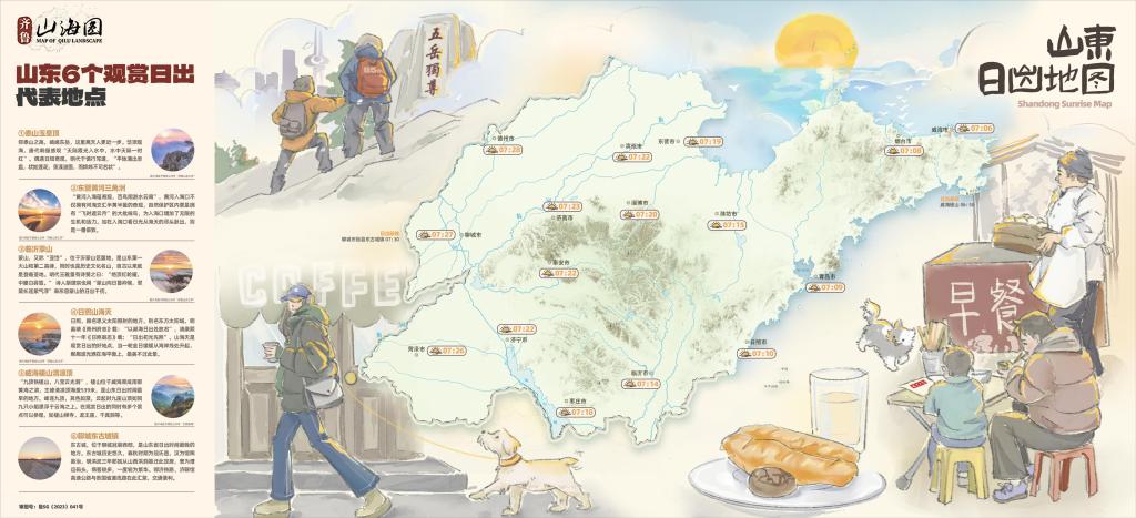 看山东日出地图,迎2024第一缕阳光 山东日出地图图中标记了在山东观赏日出的6个代表性地点:①泰山玉皇顶②东营黄河三角洲③临沂蒙山④日照山海天⑤威海槎山清凉顶⑥聊城东古城镇【发布媒体】大众新