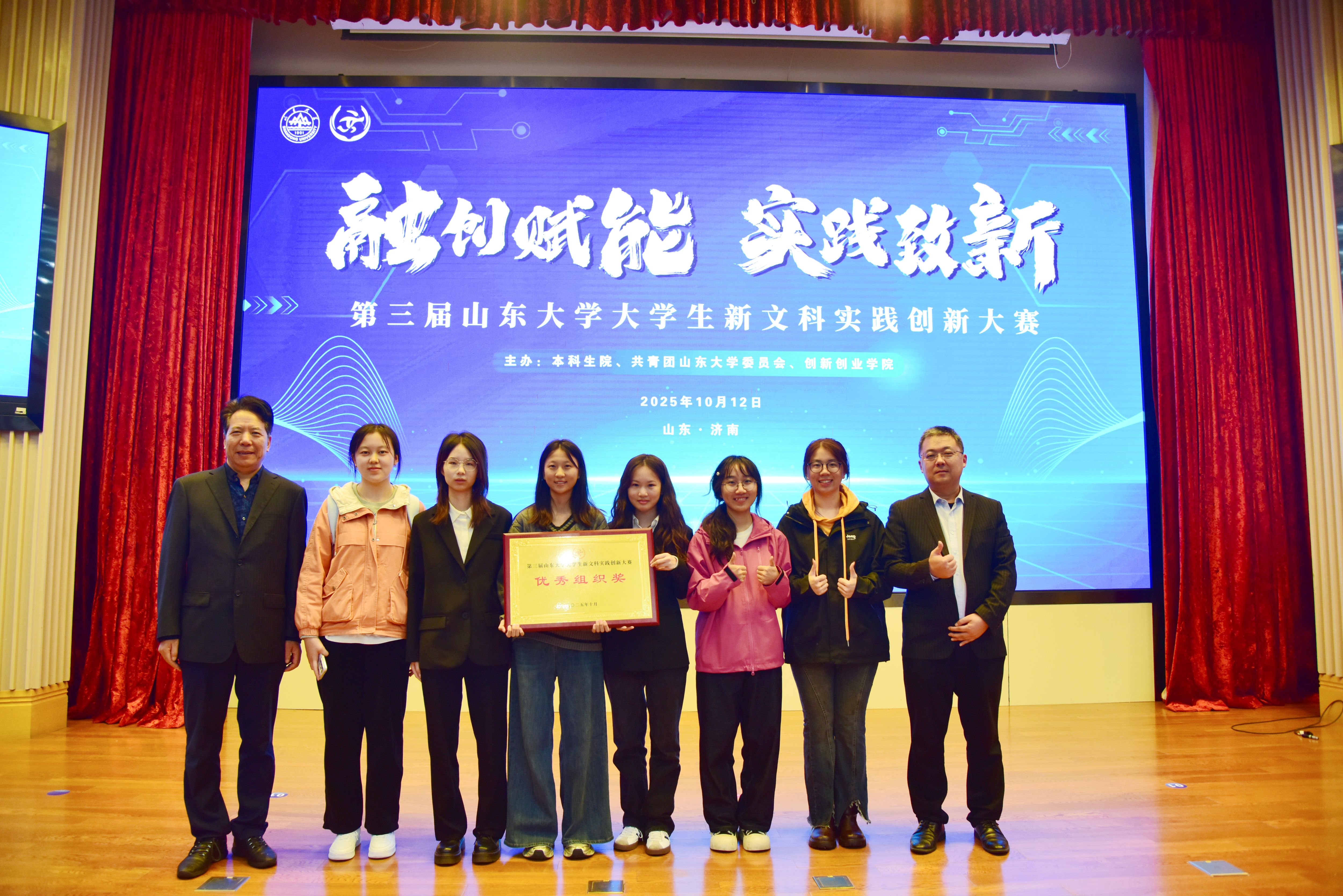 新闻传播学院在第三届山东大学大学生新文科实践创新大赛中斩获佳绩 在近日落幕的第三届山东大学大学生新文科实践创新大赛中,新闻传播学院推荐选派的五支团队进入学校决赛,最终取得银奖一项、铜奖四项,充分展现了新传学子立足专业、融创赋能的实践创新能力。新闻传播学院凭借出色的组织工作和优异的参赛成绩,荣获“优秀组织单位”称号。本次参赛获奖的五支团队聚焦非遗传承、国际传播、智慧教育、红色文化等前沿领域,选题紧密对接国家战略与社会需求,体现了新文科“交叉融合、实践致新”的...