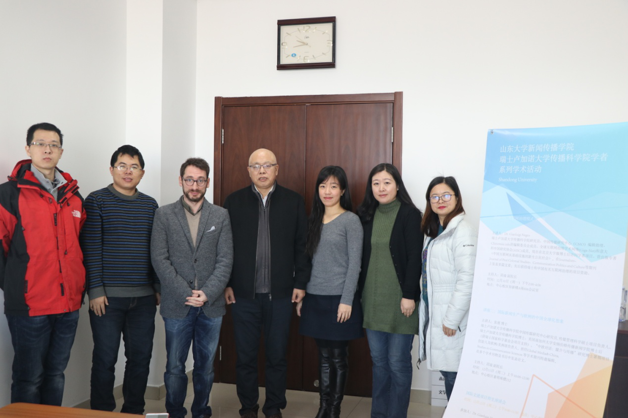 瑞士卢加诺大学学者与我院教师座谈 12月12日上午,瑞士卢加诺大学传播科学院研究员Gianluigi Negro博士、瑞士卢加诺大学传播科学院中国传媒研究中心研究员张展博士来访我院并进行座谈,我院常务副院长刘明洋教授、副院长邱凌副教授以及冯强副研究员、袁晓川副研究员、青年教师于智源参加了此次座谈。刘明洋院长首先对Gianluigi Negro博士以及张展博士的到来表示欢迎,并就学院建设与学生培养的基本情况做了简要介绍。座谈会上,张展博士与Dr.Gianluigi Negro从课...