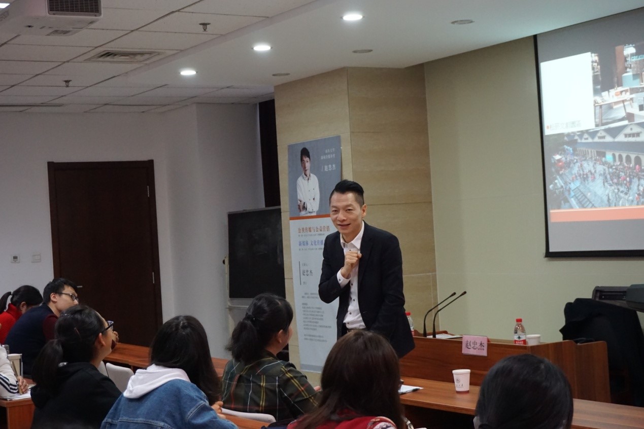 中国文化大学赵忠杰教授做客新闻传播讲堂 近日我院通过学校短期专家项目邀请了中国文化大学(台湾)国际数位媒体文学系赵忠杰教授为我院学生开设讲座,赵教授分别与10月30日和31日做了题为《公关传媒与公益营销》、《新媒体、文化传播与创意管理》的两场讲座...